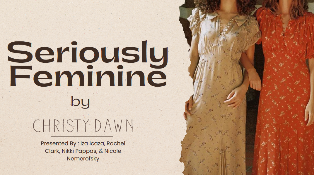 What is Christy Dawn? A small ran, sustainable, and regenerative company that prioritizes creating timeless fashion pieces while also giving back to the earth. CD is committed to environmental responsibly using farm-to-closet initiatives by working directly with farmers and artisans. A group of students and I created a pitch deck with a creative campaign of embracing woman to feel confident in the clothing that they wear and the way that they express themselves through CD’s line.